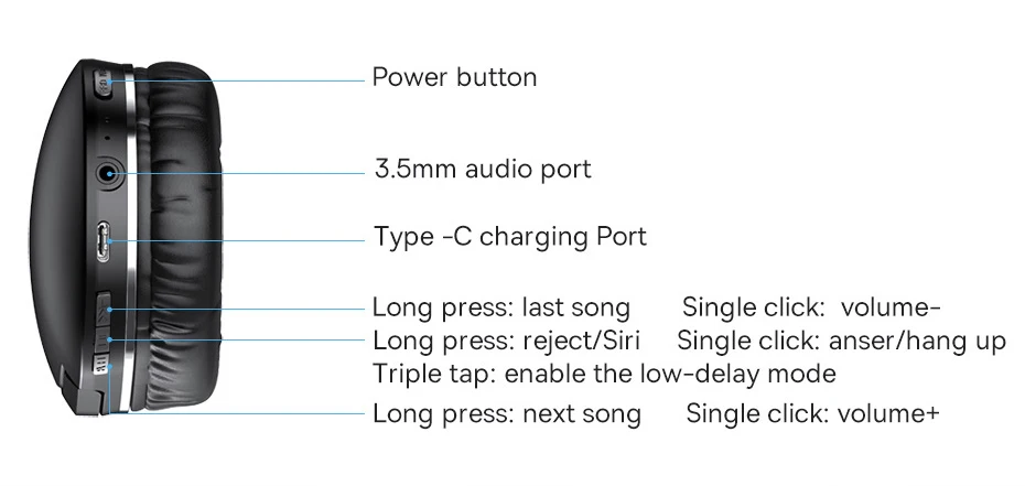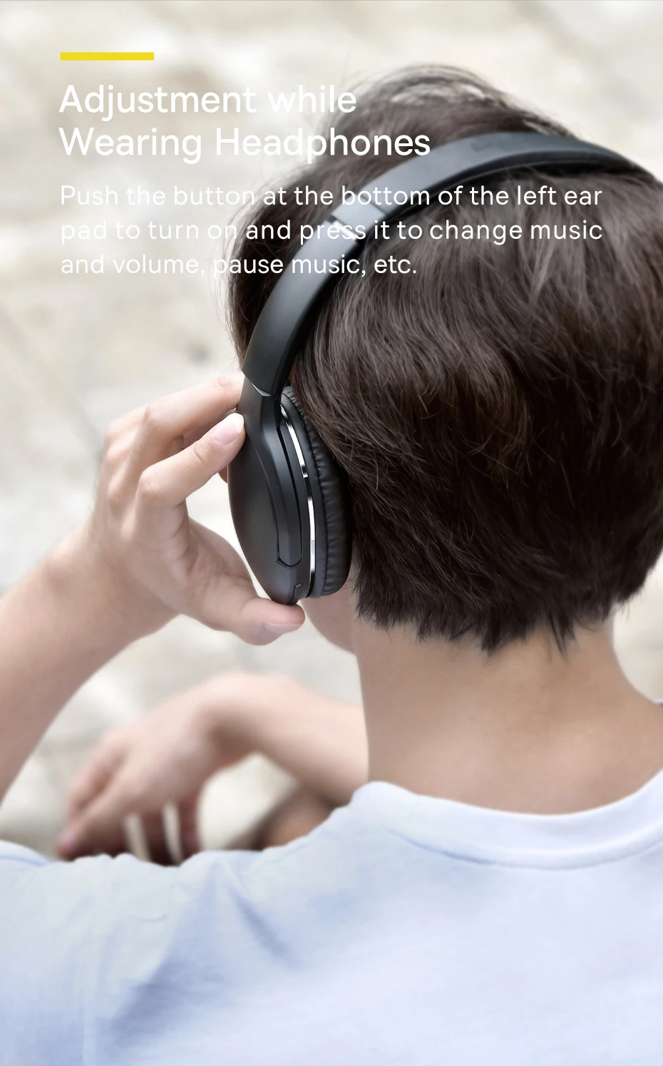Pressione o botão no botton no earpad esquerdo para ligar e pressione-o para mudar a música e o volume, pausar a música, etc.