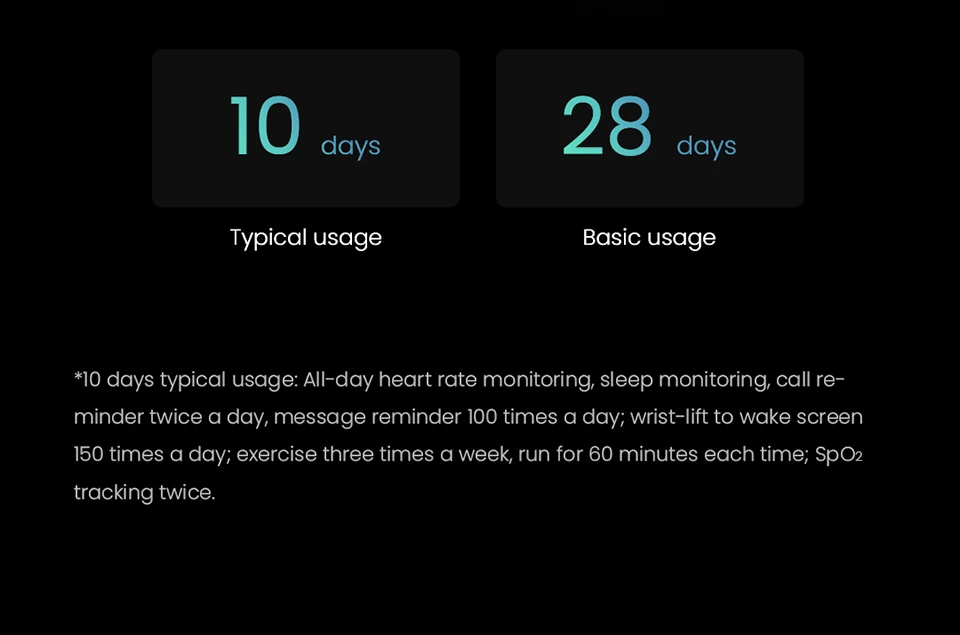 - Battery life: 10 days Daily use mode;28 days Basic use mode