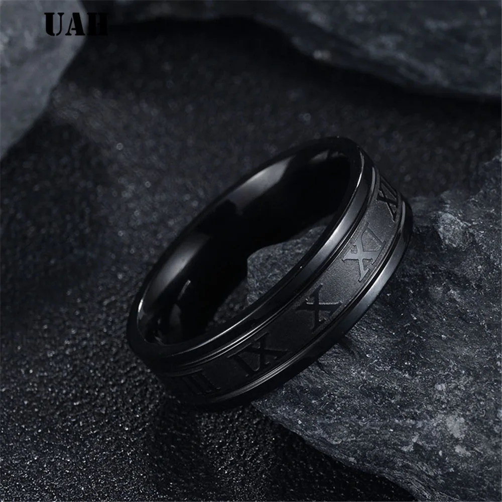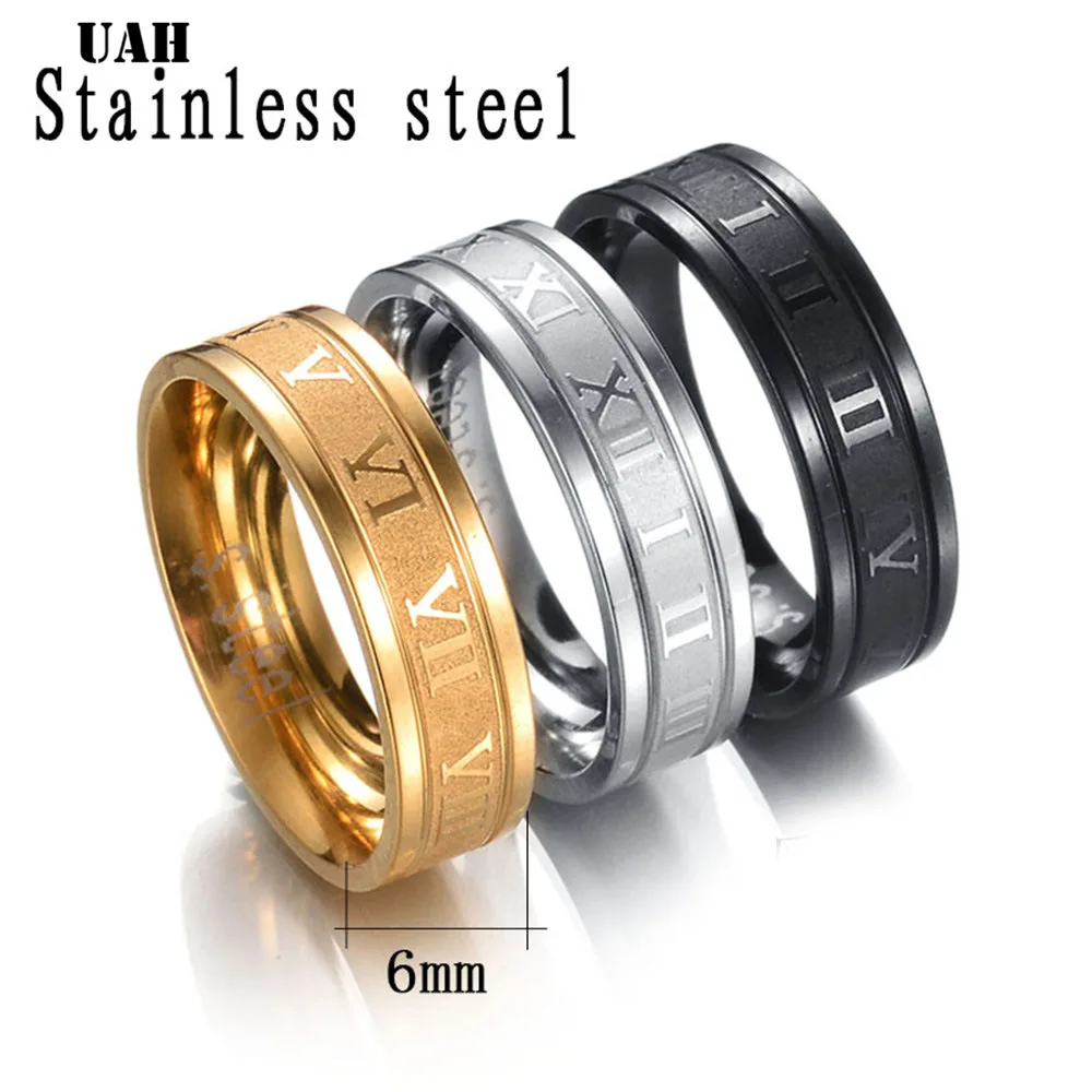 Uah 6 mm 316l anel de banda de casamento de aço inoxidável numerais romanos ouro preto legal punk anéis para mulheres masculinas moda jóias